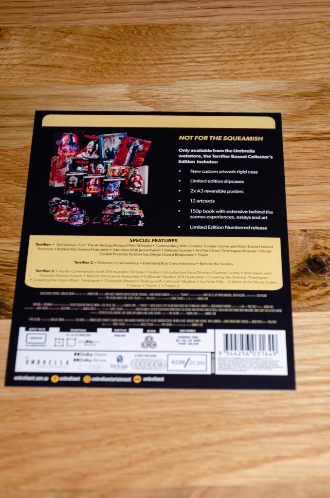 Umbrel­la Enter­tain­ment hat die Rech­te an der Ter­ri­fier-Rei­he gefres­sen, ver­daut und als ulti­ma­ti­ve Collector’s Edi­ti­on wie­der aus­ge­spuckt! Für knapp 100€ (inkl. 4€ Zoll) bekommt ihr hier mehr Splat­ter-Per-Dol­lar als Art in einer gan­zen Kil­ler­ses­si­on schafft.