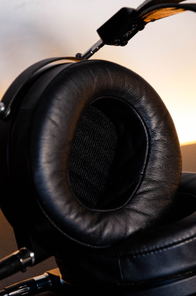 Die runden Ohrmuscheln (meine Ohren passen komplett hinein) sind für mich perfekter als die ovale Form mancher Konkurrenten wie Hifiman. Bei letzteren hatte ich das Problem, dass sie mit dem unteren Ende auf meinem Kiefer auflagen und das Sprechen in Telefonkonferenzen unangenehm machten. Beim Audeze LCD‑X hingegen stören weder die nach vorn gerichteten Kabelanschlüsse noch beeinträchtigen sie die Bewegungsfreiheit – ideal, wenn man zwischen zwei 28-Zoll-Monitoren hin und her schaut.