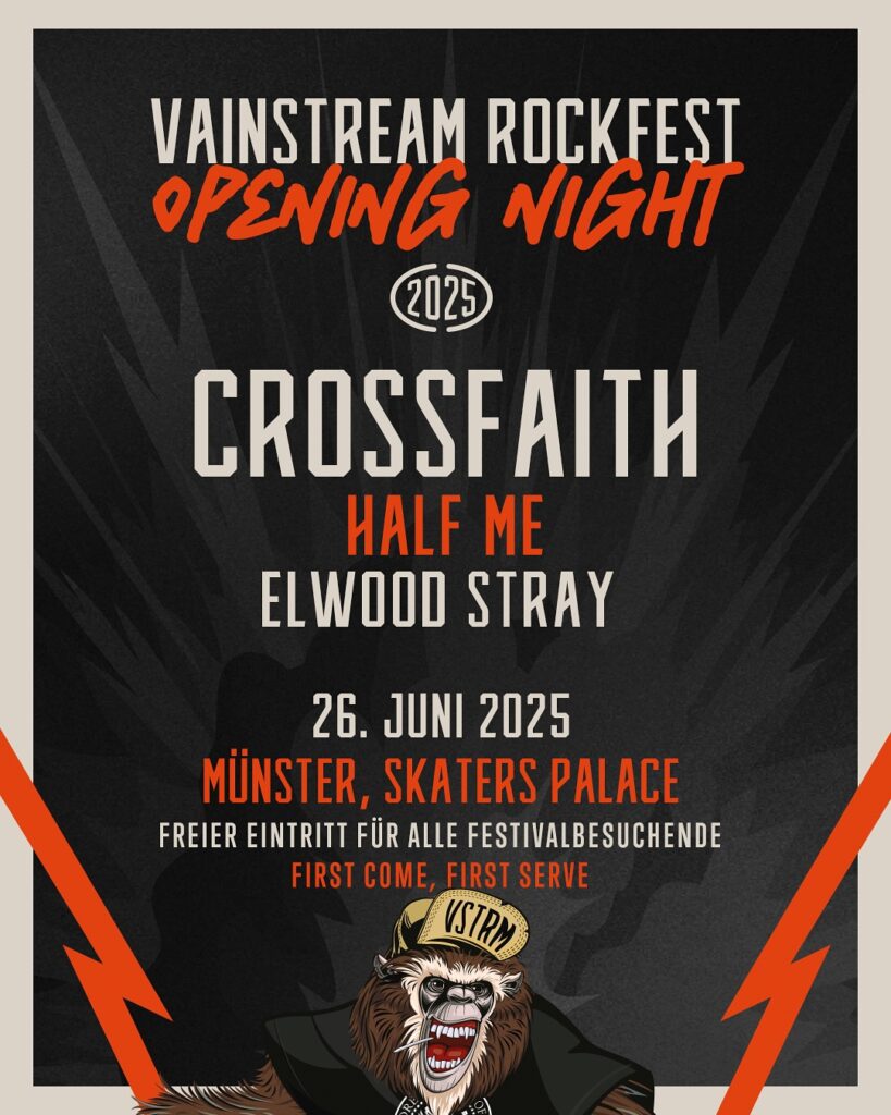 Das Vainstream Rockfest geht 2025 in die Vollen: Nicht nur, dass das Festival jetzt an zwei Tagen abgeht – für alle, die es kaum erwarten können, startet das Spektakel schon am Donnerstagabend mit einer fetten Opening Night im Skaters Palace! Am Start sind Crossfaith, Half Me und Elwood Stray. Perfekt, um sich direkt das Festivalbändchen zu sichern und kostenlos mit anderen Metalheads warmzulaufen, bevor Münster endgültig zerlegt wird.