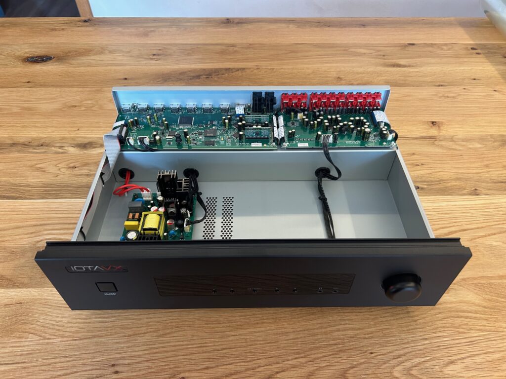 Wir haben unseren Plattenspieler mit einer Graham Slee GramAmp 2 SE Phono-Vorstufe an die IOTAVX AVX 17 angeschlossen. Natürlich wandelt die Vorstufe das analoge Signal zunächst in ein digitales um – anders wären DSP und Lautstärkeregelung nicht möglich. Dennoch ist der Klangunterschied zur komplett analogen Kette erstaunlich gering.