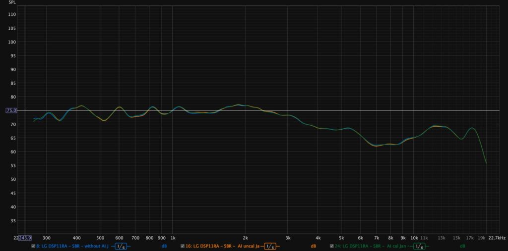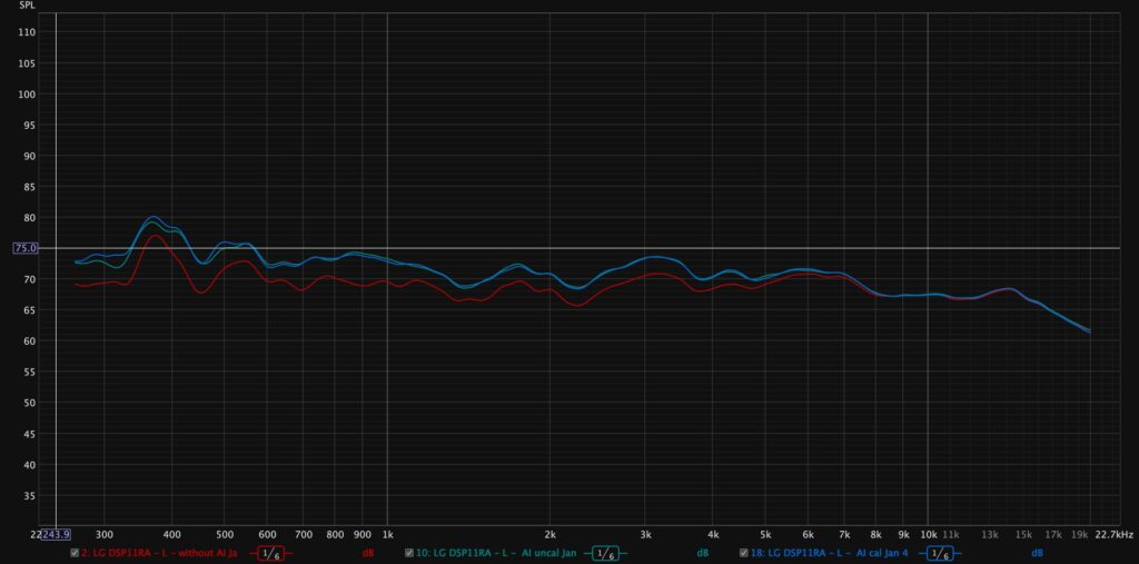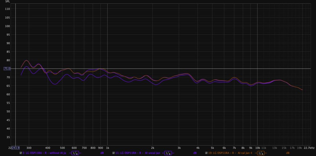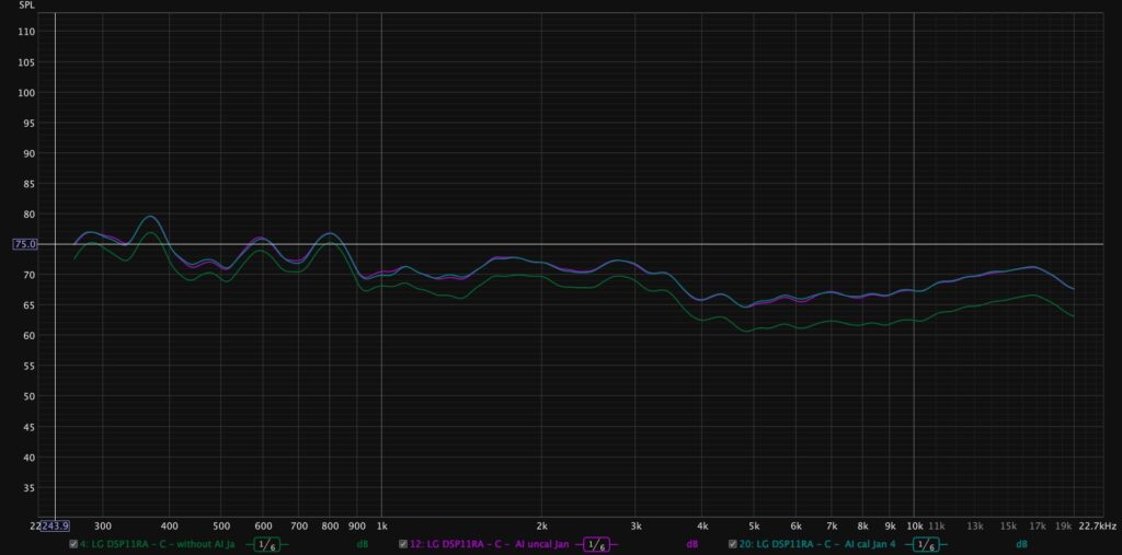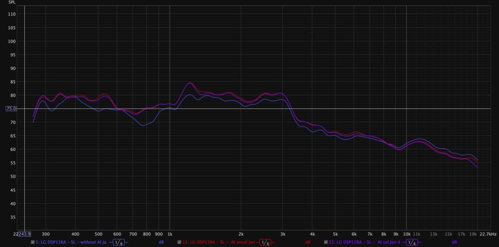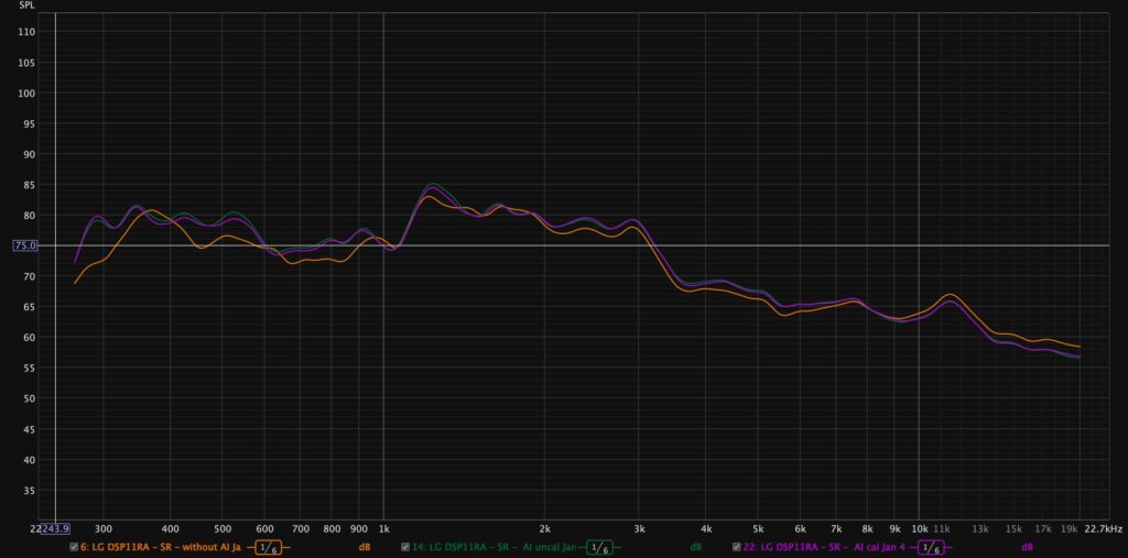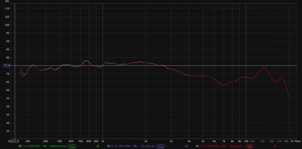 Natürlich haben wir uns es nicht nehmen lassen alle Kanäle mal auf Herz und Nieren zu prüfen und haben mit REW Nachgemessen. Wir wollten wissen was die AI Kalibierung messtechnisch an unserem Referenzhörplatz ausmacht.