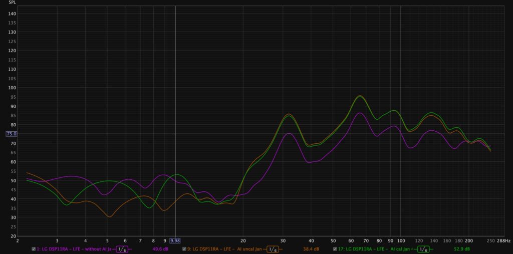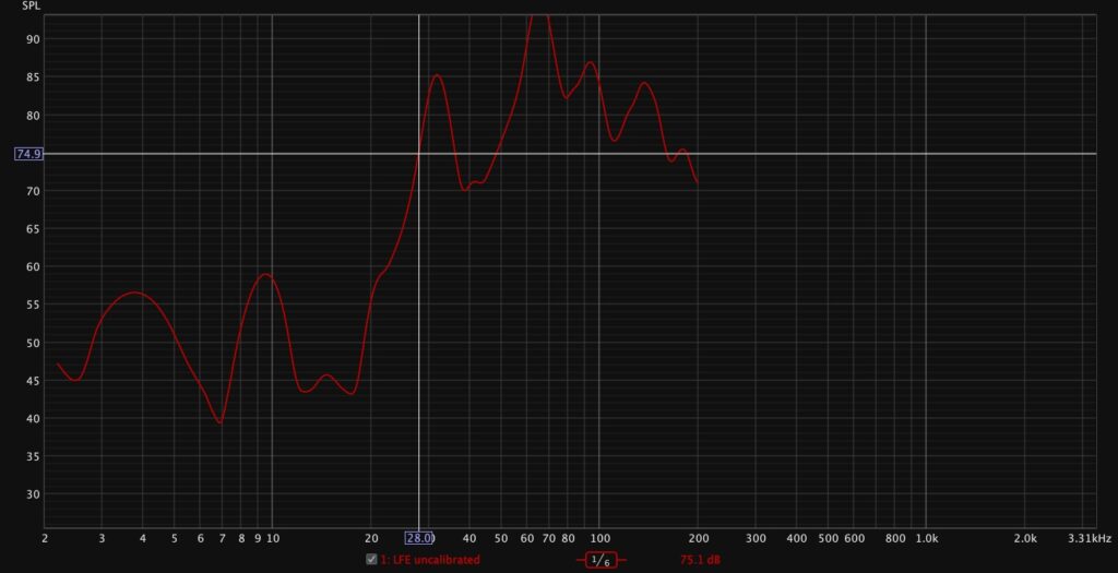 Bei einem Referenzpegel von 75 Dezibel sehen wir, dass der Sub ab ca. 28 Hz ordentlich anfängt zu pumpen. So bedient der Subwoofer noch den oberen Bereich des Spaß-Frequenzbereichs (10–40 Hz wo man im besten Falle ordentlich was im Magen spürt). Dennoch hat der Subwoofer in unserem 35qm Zimmer ordentlich zu tun. Wir haben den Subwoofer direkt neben dem Lowboard stehen mit einem ca. 10 cm Abstand zur Wand. In Filmen wir Tennet, Dune, Blade Runner 2049 oder Kong hat er ordentlich zu kämpfen, um unseren Raum mit druckvollen Bässen zu versorgen. Sicherlich hat er in einem kleineren Raum leichteres Spiel. Dennoch muss man sagen, klappt auch dies und die meisten Heimkino-Einsteiger werden begeistert sein, welchen Druck er entfalten kann. Leider muss man aber auch sagen, dass er schon ein wenig verzerrt. Er klingt nicht so knackig wie ein externer Bolide von SVS, Velodyne, Arendal oder ähnlichem. Muss er aber auch nicht, da solche Subwoofer teilweise schon so viel kosten wie LG’s Soundbar-Set.