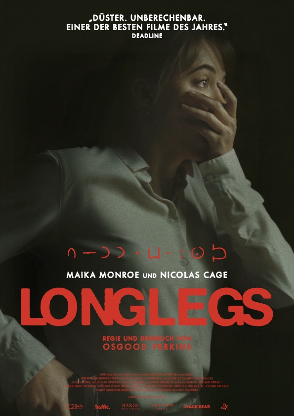 Prominent besetzt mit Nicolas Cage als Serienkiller Longlegs. In der Hauptrolle ist Maika Monroe zu sehen, die die FBI-Agentin Lee Harker verkörpert und den Serienkiller Longlegs jagt, welcher seine Opfer auf mysteriöse Weise dazu zu bringen scheint, ihre Familien und sich selbst zu töten.