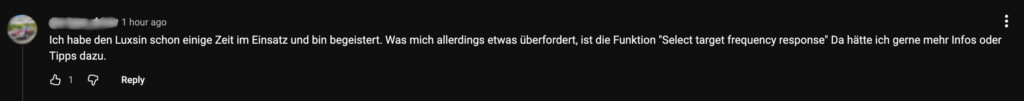 Ich habe den Lux­sin X9 HPEQ schon eini­ge Zeit im Ein­satz und bin begeis­tert. Was mich aller­dings etwas über­for­dert, ist die Funk­ti­on ‘Sel­ect tar­get fre­quen­cy respon­se’. Da hät­te ich ger­ne mehr Infos oder Tipps dazu.