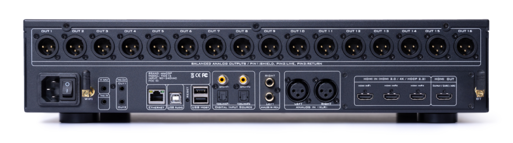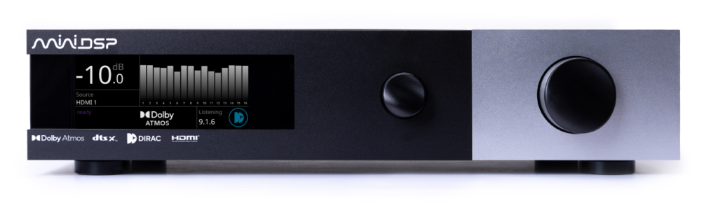 Der miniDSP Tide16 ist eine 16-kanalige AV-Vorstufe mit voller Atmos- und DTS:X‑Dekodierung, HDMI-Umschaltmatrix, Bluetooth-Streaming und Dirac-Raumkorrektur. Und zwar nicht irgendeine Raumkorrektur, sondern die ganze Dirac-Research-Suite: Dirac Live Full Range, Bass Control, Active Room Treatment. Alles perpetual lizenziert, alles serienmäßig. Wer diese drei Lizenzen einzeln kauft, ist locker 800 Dollar los. Hier kostet das genau nichts extra.