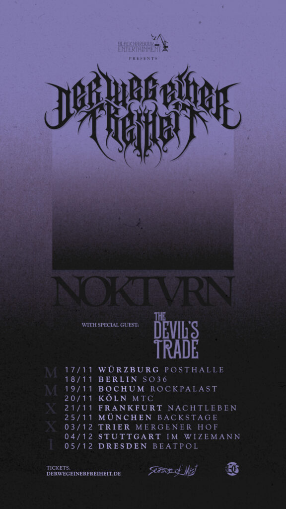 Noktvrn, so wird das neue Album der deutschen Black-Metal Band “Der Weg einer Freiheit” heißen, welches schon am 19.09.2021 veröffentlicht wird. Einen ersten Vorgeschmack geben die Würzburger mit der Single “Morgen” welche ihr euch oben reinziehen könnt. Die Besonderheit hier ist das es sich hier um das erste Musik-Video der Band handelt. Wir sind schon gespannt auf das was uns auf dem Nachfolger des letzten vier Jahre alten Albums “Finisterre” erwartet.