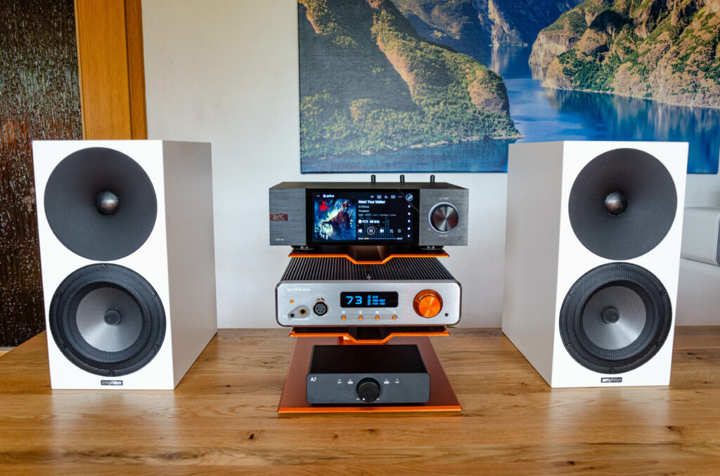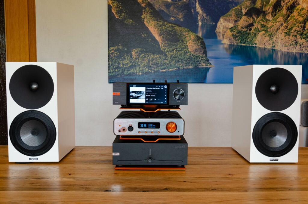 Hab ich natürlich dran gehabt und den Conductor GT4 als Pre‑Amp fungieren lassen. Hier hatte ich einiges mal wieder dran. Der Transaudio d5pro macht, was von ihm erwartet wird. Er gibt dem Ganzen ein wenig Wärme, ohne dabei irgendwelche Details zu verlieren. Als Lautsprecher kamen hier die Amphion Argon3S zum Einsatz und wer unseren Test gelesen hat, weiß, was für leistungsstarke Lautsprecher das sind. Ja, die Kombo kostet jetzt schon ohne Kabel jenseits der 7000 € und spielt sicherlich in noch höheren Sphären mit. Wenn man hier noch einen Subwoofer in den Mix gibt … andere Baustelle.