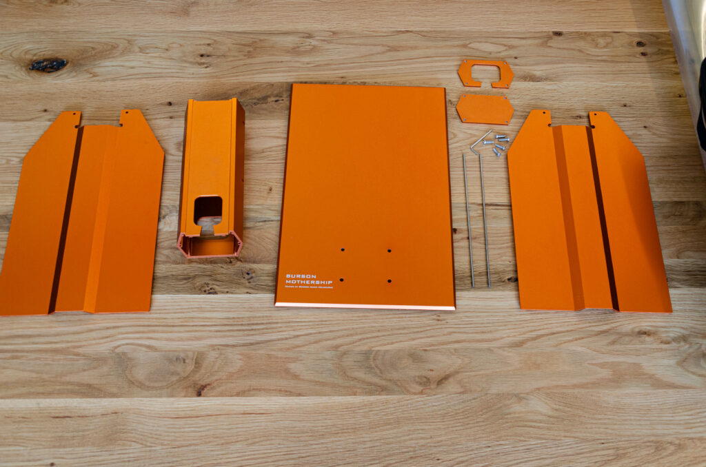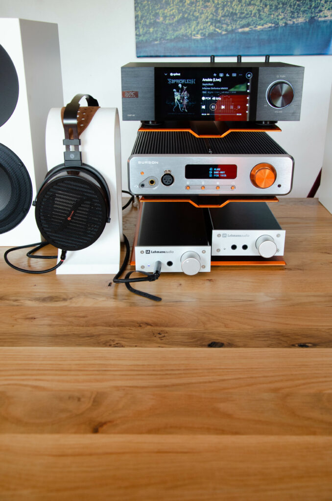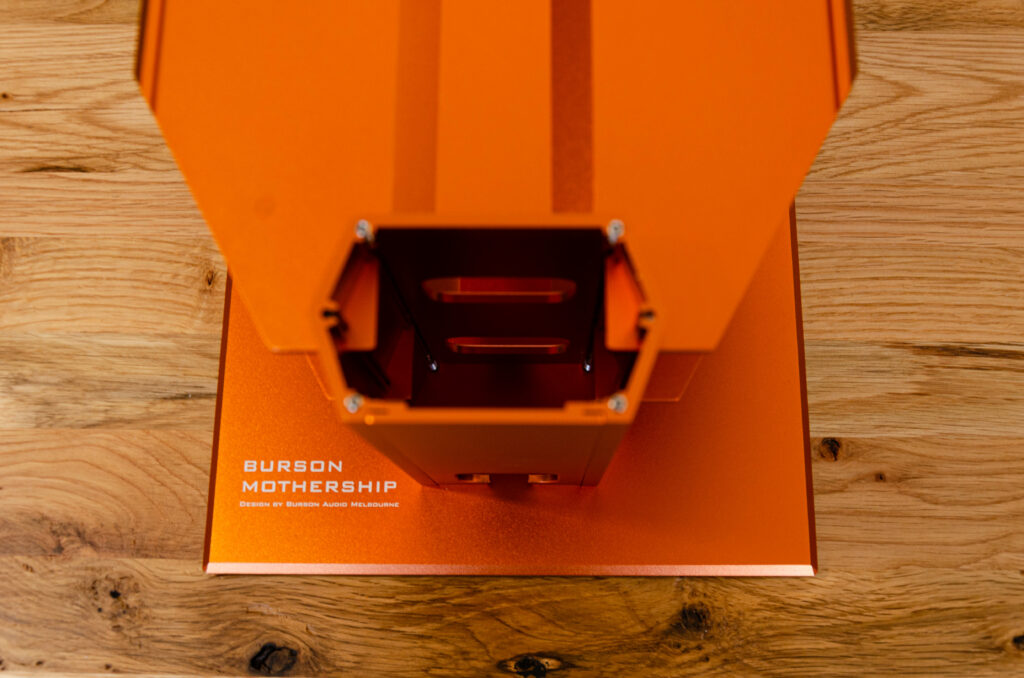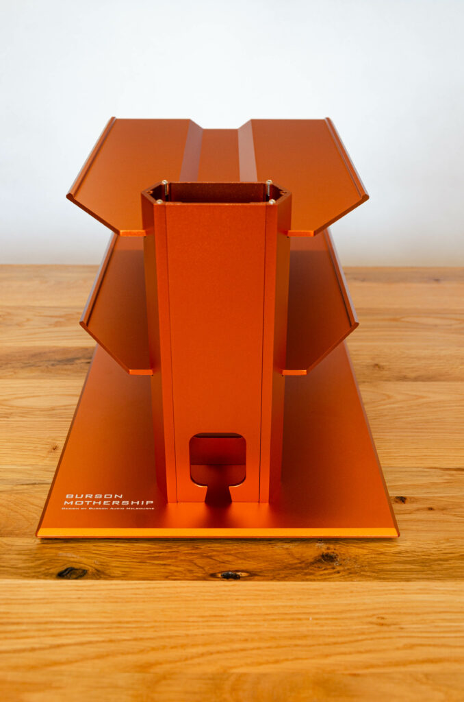 Ihr habt das geile orange Rack gesehen, auf welchem der Burson Conductor GT4 thront? Jap! Die Kiste ist auch von Burson Audio und ein affengeiles Teil. Das Burson Audio Mothership. Sieht geil aus, passt farblich zu deren Geräten und ist einfach ein Hingucker. Interne Kabelführung, voll Aluminium und mit zwei oder vier Ebenen. Mega massiv und passt natürlich wie angegossen zu Burson‑Audio‑Produkten.