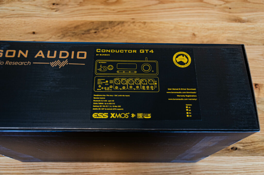 Hat man das Biest erst einmal aus seinem Gefängnis befreit, muss man dem knapp 5 kg schweren Gerät erst einmal gebührend Respekt zollen. Hier bekommt man nicht nur Werbeversprechen, sondern ein ordentliches Stück Hardware. Der Burson Conductor GT4 strahlt sofort High‑End‑Allüren aus und lässt uns aufgeregt nach dem Zubehör schauen, um schnellstmöglich eine Hörprobe zu bekommen.