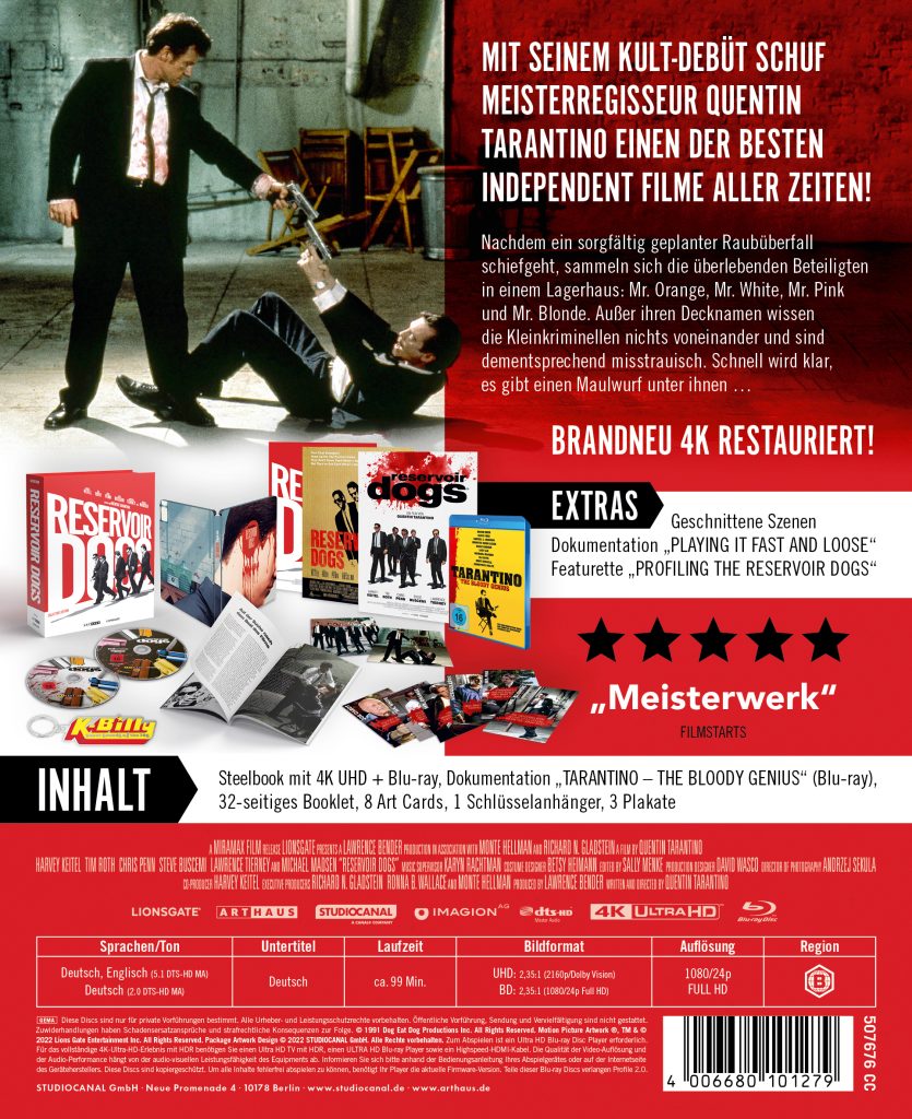 Studiocanal wird exklusiv im Arthaus-Shop auf der Plaion Seite die limited Collector’s Edition verkaufen. Mit an Board sind dann neben dem 4K Steelbook noch weitere Extras. Und zwar ein 32-seitiges Booklet, 3 Poster, 8 Artcards, Dokumentation: “Tarantino — The bloody Genius” (Blu-ray), K‑BILLY Schlüsselanhänger.