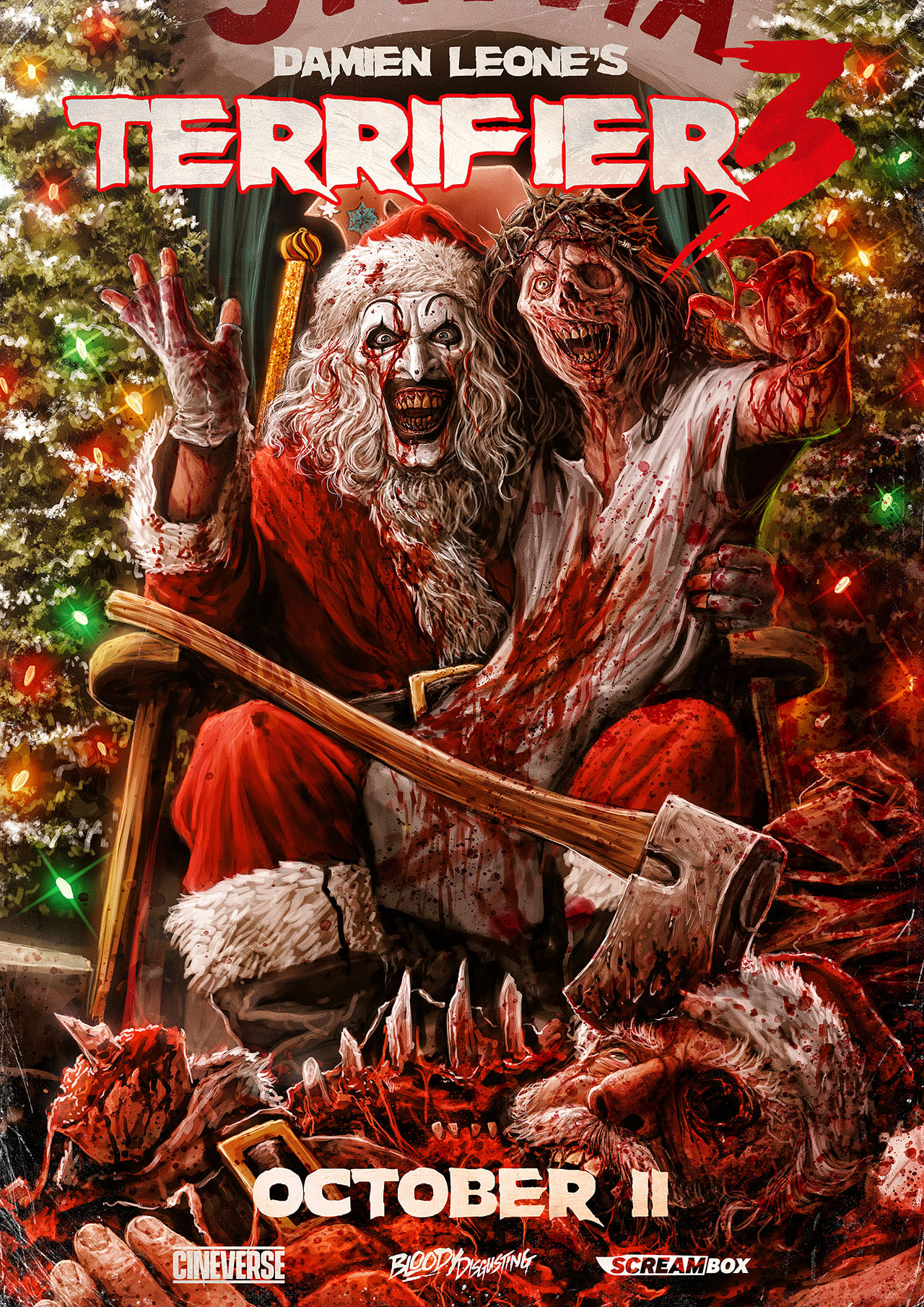David Howard Thornton wir natürlich wieder in seine Paraderolle als Art der Clown schlüpfen. Wer hätte es anders erwartet? Terrifier ohne Final Girl Lauren LaVera? Quatsch, natürlich verkörpert sie zusammen mit Elliot Fulham wieder die Shaw-Geschwister. In den weiteren Rollen findet sich Prominenz wie WWE-Legende Chris Jericho, „Lost-Boys“-Star Jason Patric, dem Kult-Maskenbildner Tom Savini („Die Rückkehr der Untoten“) und Horrorfilm-Ikone Daniel Roebuck („The Devil’s Rejects“) als Santa Claus. Ob hier Tom Savini auch selber beim Maskenbildnern handangelegt hat ist bisher nicht bekannt, aber wer weiß?
