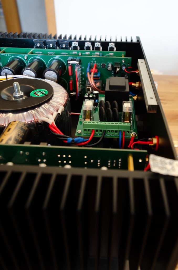Alle kleineren Kondensatoren auf den Platinen sind von Nichicon. Man kann also nicht meckern über die gewählen Komponenten. Die Verkabelung ist auch sehr hochwertig ausgeführt. Hier fallen zum einen die Teflon ummantelten Kabel von der Kaltegerätesteckerdose zum ersten Schaltboard auf, aber auch die 4mm² Lautsprecherkabel, welche laut Angaben auf dem Kabel, auch in korrekter Signalflussrichtung montiert wurden.