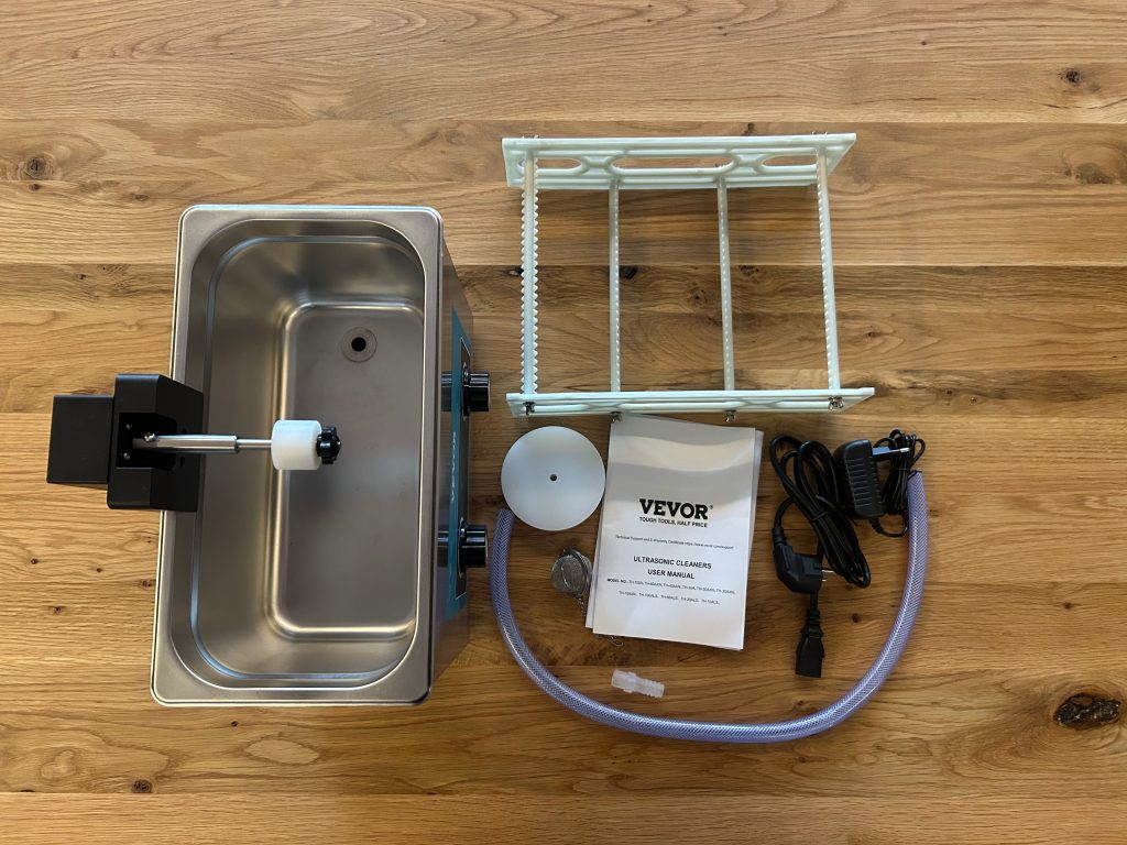 Geliefert wird das Vevor Reinigungsgerät mit allerlei praktischem Zubehör. Neben dem ca. 6L fassenden Ultraschallgerät befindet sich ebenfalls der Motor mit Achse und Abstandshaltern aus milchigem Plexiglas, einem Schlauch, Sieb, sowie Netzteil, Kaltgerätestecker und ebenfalls eines Schallplatten Trockenständer und Anleitung, im Karton.