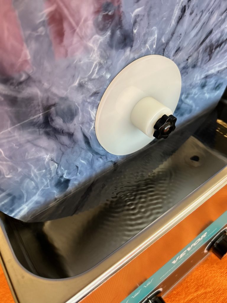 Also: Knosti Disco-Antistat Ultraclean angemischt mit destilliertem Wasser und das Gerät befüllt. Idee war ebenfalls den Rest nach dem Reinigen durch einen Filter fließen zu lassen um den Staub und Partikel abzufiltern und die Flüssigkeit wiederzuverwenden. Ergo habe ich noch den Ablassschlauch montiert. Weiterhin noch schnell den Motor auf den Rand des Beckens geklemmt, alles angeschlossen, Gerät befüllt und dann die Achse vom Motor zum befüllen mit Schallplatten abmontiert.