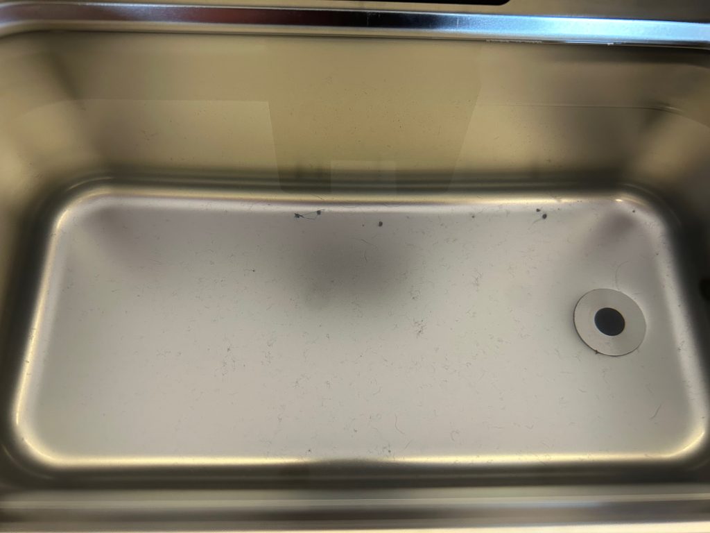 Natürlich haben sich während des Reinigungsprozesses immer mehr “Schwebkörper” im Wasser abgesetzt, welche erfreulicherweise direkt am Boden des Ultraschall-Geräts verblieben sind und somit mich nicht gezwungen haben, hin und wieder das Wasser mit der Reinigungsflüssigkeit zu reinigen. Dennoch muss man sagen, ist so einiges in dem Gerät hängen beblieben. Ich habe euch extra mal meine “Ausbeute” einmal im Gerät und einmal in meinem Filter (ist nen 125 Micron Filter aus dem 3D Druck) fotografiert, damit man mal sehen kann was von so nahezu nigel nagel neuen Platten so runter kommt.