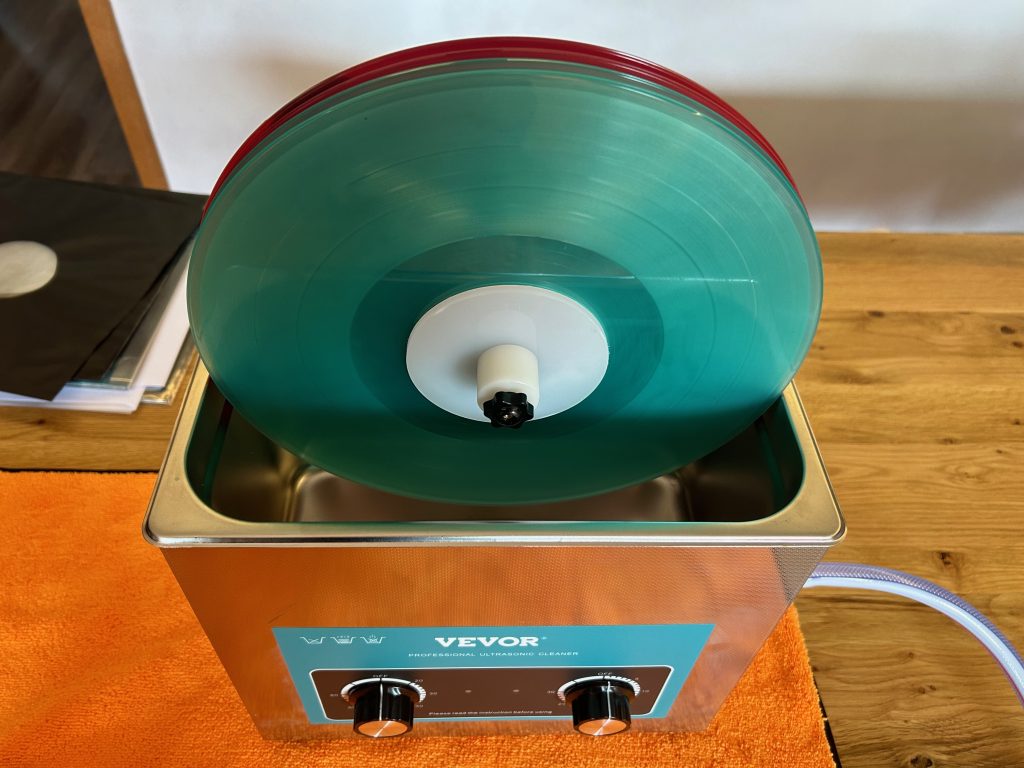 Bevor ich natürlich eine meiner kostbaren Stücke einfach so in so nen Gerät rein tunke, hab ich das Ultraschall Reinigungsgerät natürlich erstmal leer laufen lassen. Fazit: kein schönes Geräusch. Grausam. Und dazu auch noch laut. Ergo, Airpods raus und währenddessen Musik hören. Ist eh viel entspannter, wenn man sich schon mal ein wenig warm hören kann. Zur Verteidigung: mit Platten im Gerät ist das Geräusch um ein vielfaches Leiser und erträglicher. Dennoch ist ein Gehörschutz oder Kopfhörer die angenehmere Alternative.