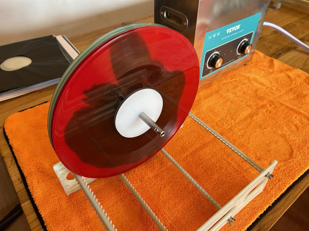 Nachdem ich die Platten habe einige Zeit, keine Ahnung so 2–3 Minuten habe rotieren lassen wurden sie erlöst und mit einem weichen Tuch vorsichtig abgewischt und auf den wirklich genialen Trockenständer gestellt, um komplett zu trocknen. Beim Abwischen wollte ich schon mal ein Großteil der verbleibenden Flüssigkeit los werden, damit mir diese nicht über die Labels läuft oder so. Weiterhin erhoffe ich mir daraus, vielleicht noch verbleibenden Staub mit aufzunehmen. Ob mir das so gelungen ist, ist schwer zu sagen. Ob der Weg der Richtige ist ebenfalls. Was ich aber sagen kann ist, dass die Platten nach der Reinigung sichtbar besser aussagen.